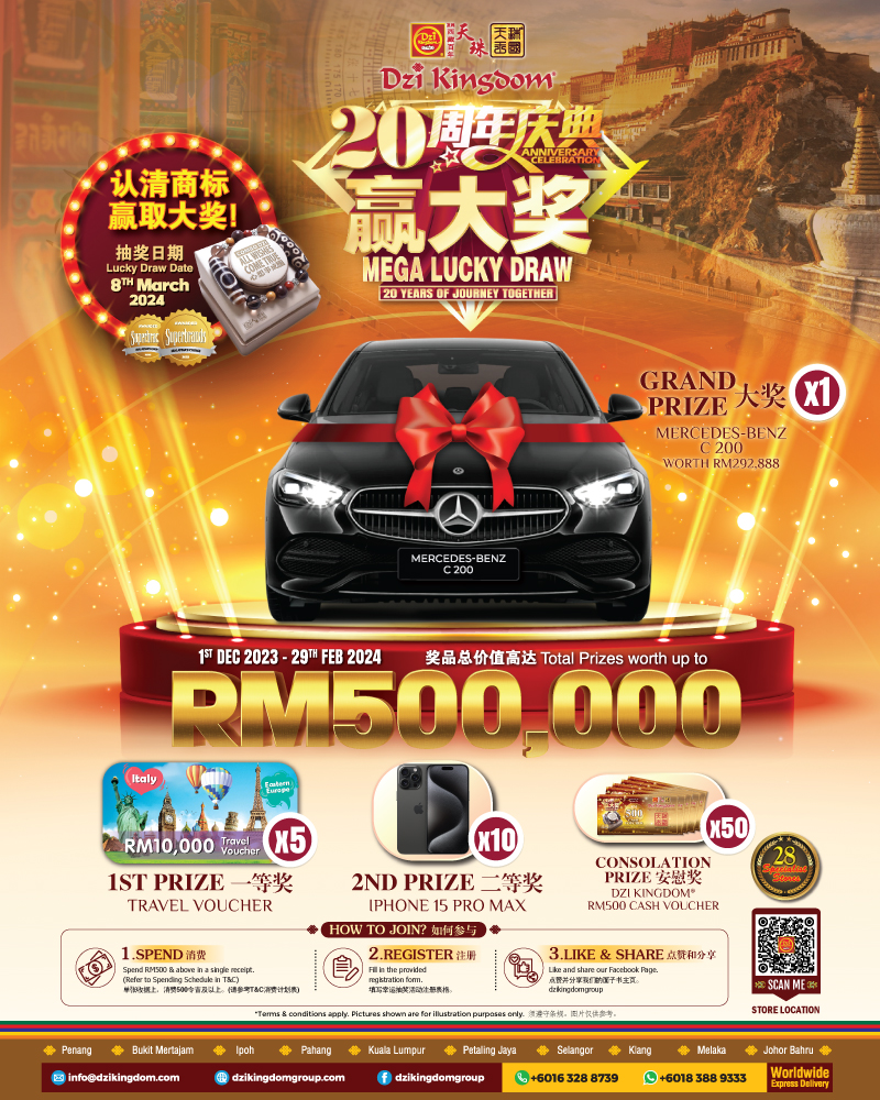 “Dzi Kingdom® 20 Years of Journey Together” (“Lucky Draw Contest”) is organised by Dzi Kingdom® (“The Organiser”) and shall be held from 1st December 2023 to 29th February 2024. (“Contest Period”)