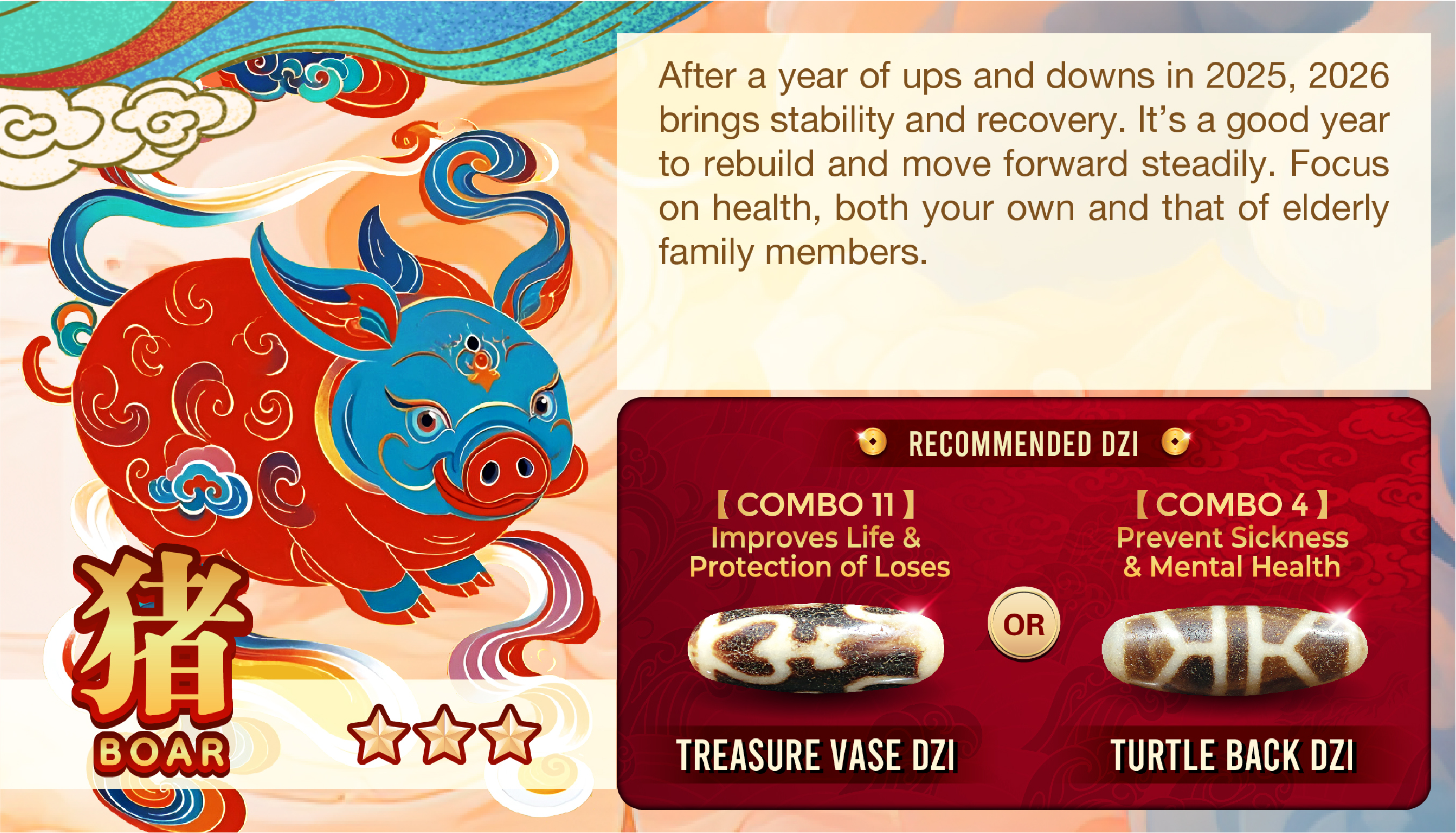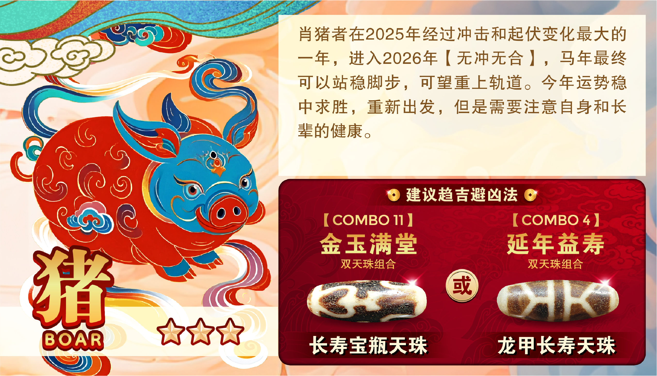 肖猪者在2025年经过冲击和起伏变化最大的一年,进入2026年【无冲无合】,马年最终可以站稳脚步,可望重上轨道。今年运势稳中求胜,重新出发,但是需要注意自身和长辈的健康。