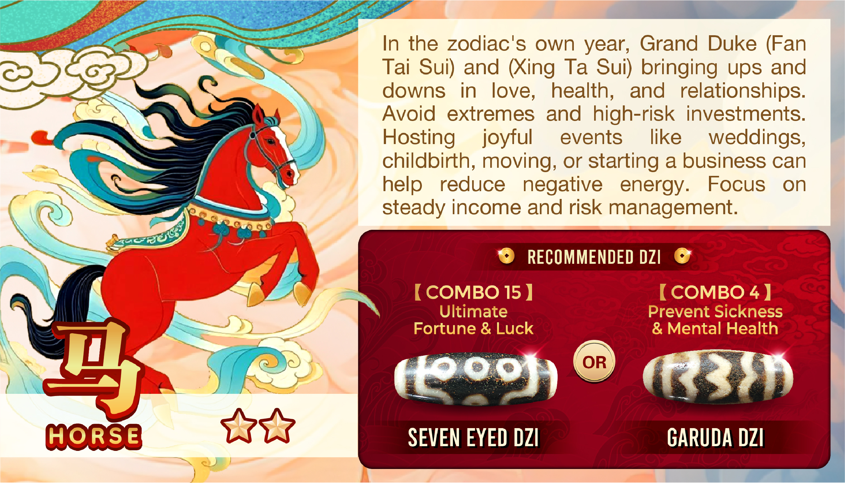In the zodiac's own year, Grand Duke (Fan Tai Sui) and (Xing Ta Sui) bringing ups and downs in love, health, and relationships. Avoid extremes and high-risk investments. Hosting joyful events like weddings, childbirth, moving, or starting a business can help reduce negative energy. Focus on steady income and risk management.