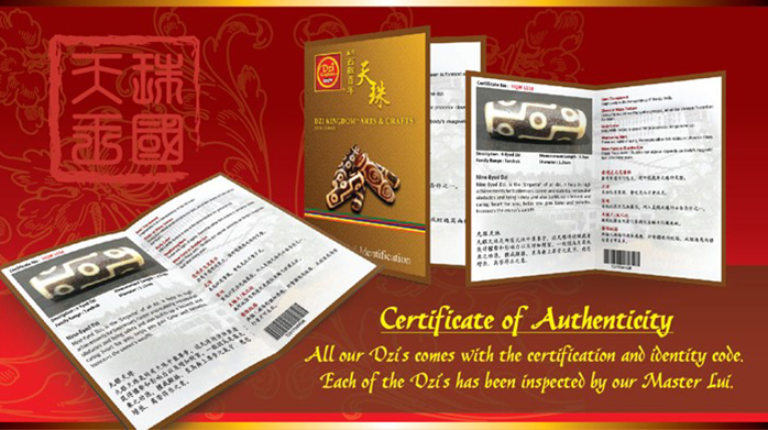 All our Dzis comes with the certification and identity code. Each of the Dzi has been inspected by our Master Lui.